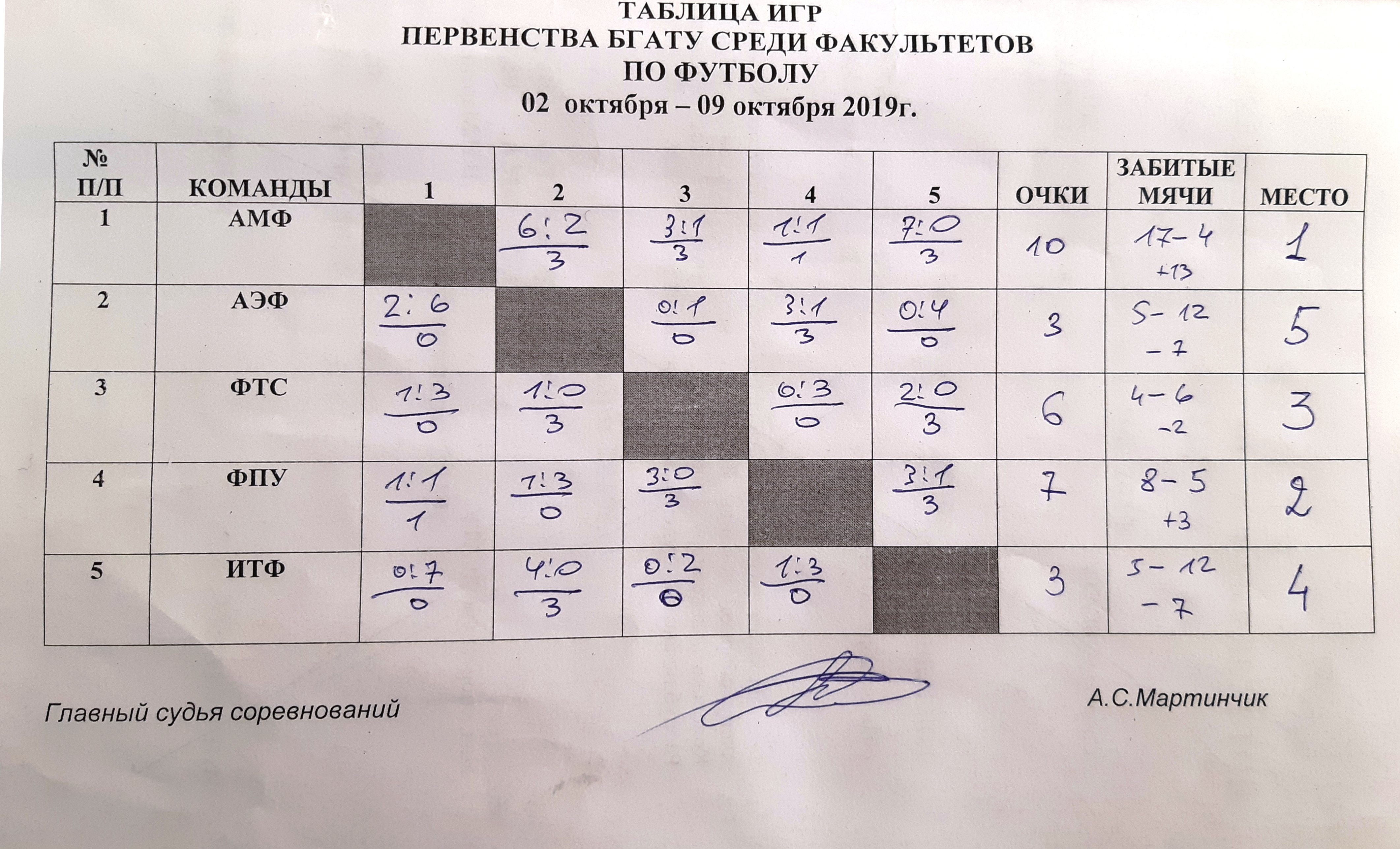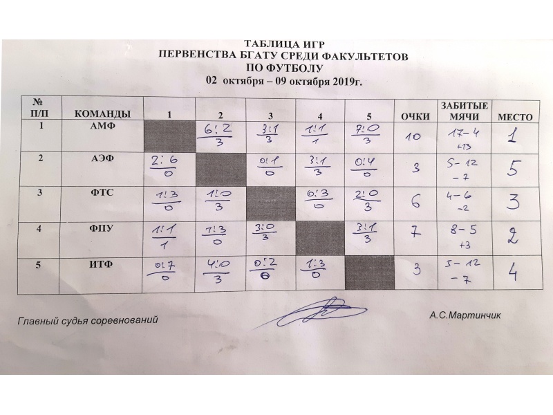 11.10.2019Отдел по идеологической и воспитательной работес 02 по 09 октября 2019 года в БГАТУ прошло первенство по футболу среди факультетов. Поздравляем команду агромеханического факультета занявшую 1 место! Фотогалерея: Теги: здоровый образ жизни, 65 лет БГАТУ