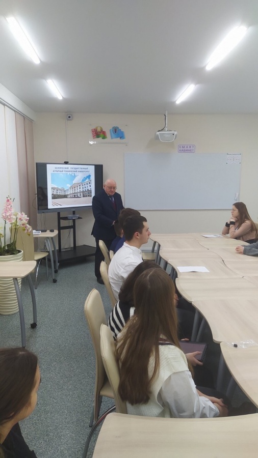 В ходе беседы учащимся выпускных классов были разъяснены правила поступления в Учреждение образования «Белорусский государственный аграрный технический университет», особенности факультетов и специальностей. С докладом выступил заведующий кафедры сельскохозяйственных машин, доктор технических наук, профессор Чеботарев Валерий Петрович.