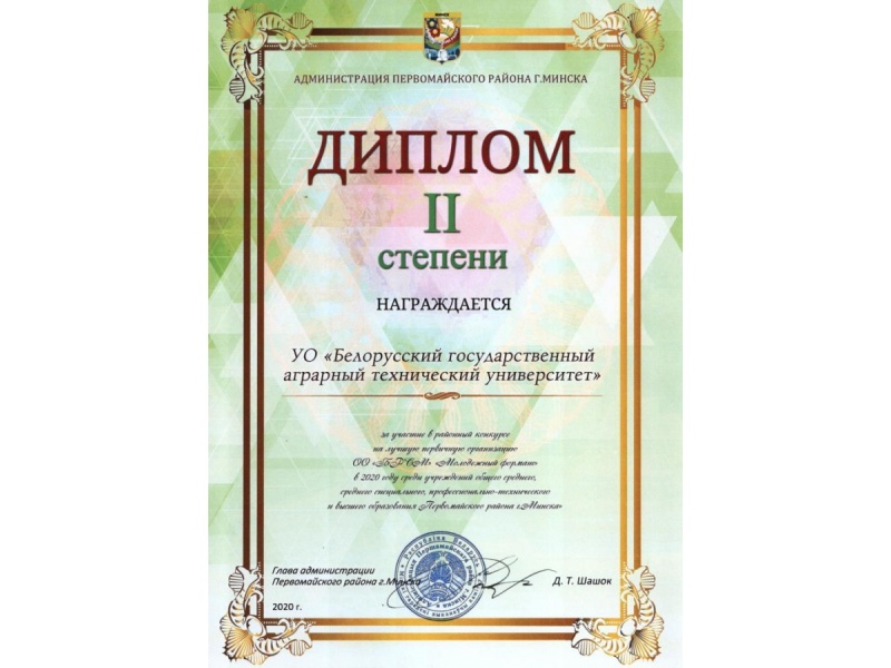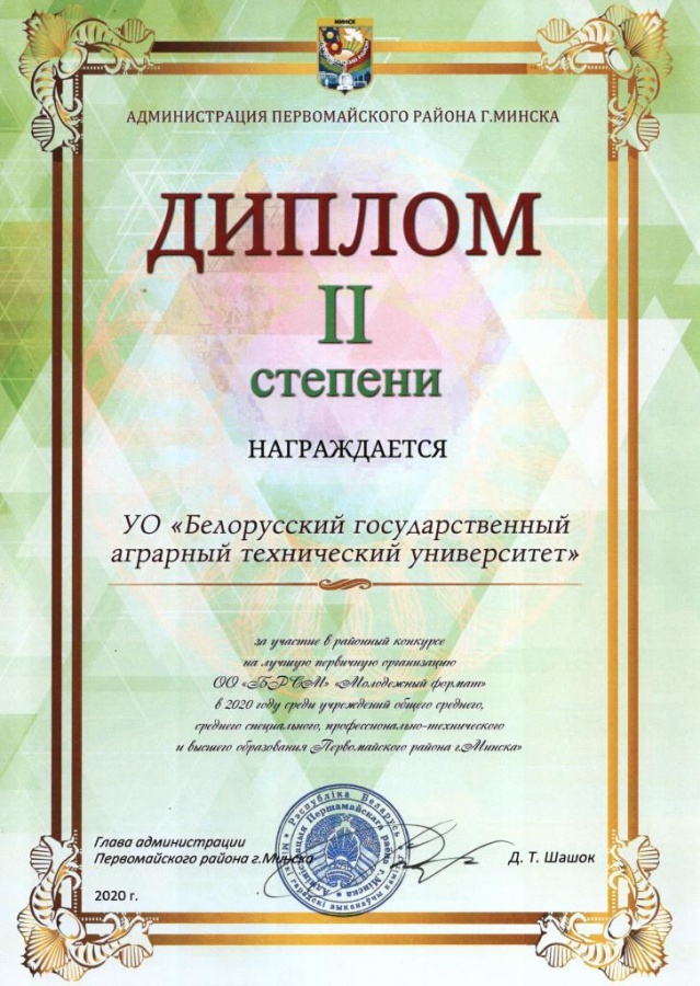 22 декабря 2020 года студенческий актив БГАТУ принял участие в районном гражданско-патриотическом форуме "Храним прошлое, ценим настоящее, строим будущее!", приуроченном к 75-летию окончания самой кровопролитной в истории человечества Второй мировой войны с участием представителей администрации Первомайского района г. Минска, депутатов Палаты представителей Национального собрания Республики Беларусь и депутатов Минского городского совета депутатов. По итогам районного конкурса на лучшую первичную организацию ОО "БРСМ" первичная организация ОО "БРСМ" БГАТУ заняла второе место. Наши студенты помогают всем тем, кто нуждается в помощи: детям-сиротам, инвалидам, одиноким пенсионерам. Наша первичка постоянный спонсор всех молодежных мероприятий, которые проходят в БГАТУ. А еще, они просто активные, спортивные и не равнодушные. Молодцы ребята!