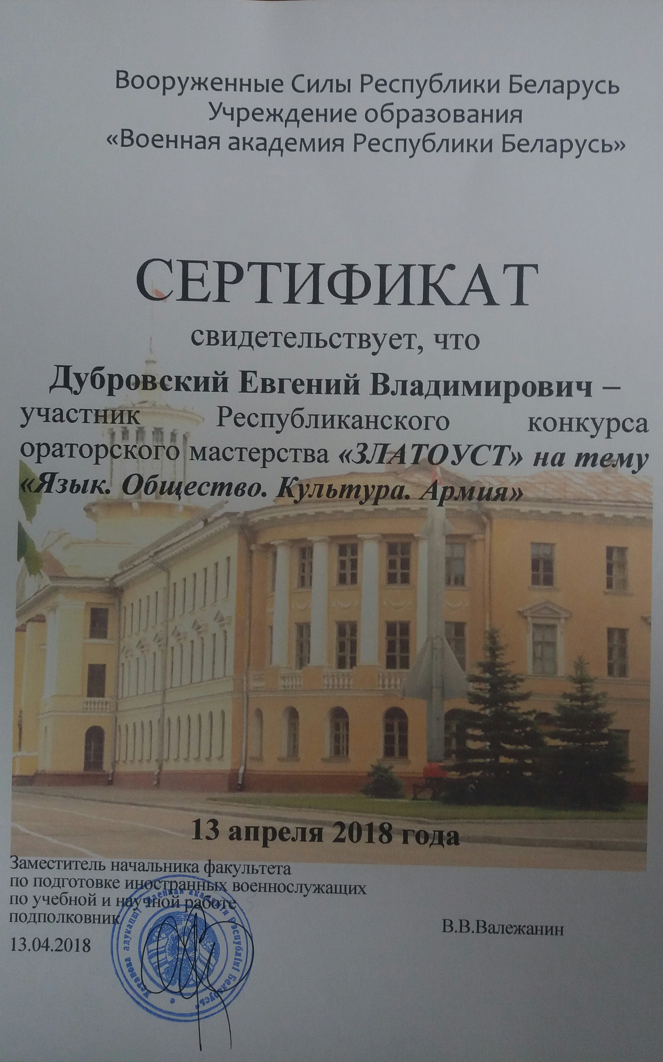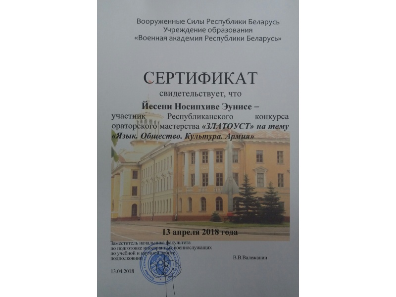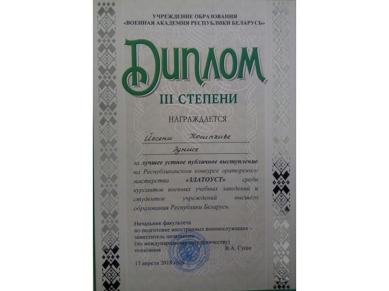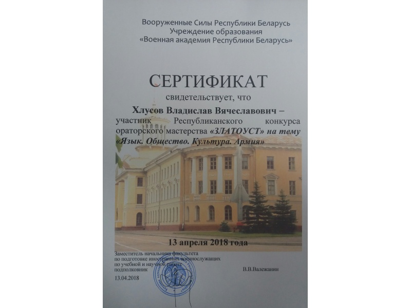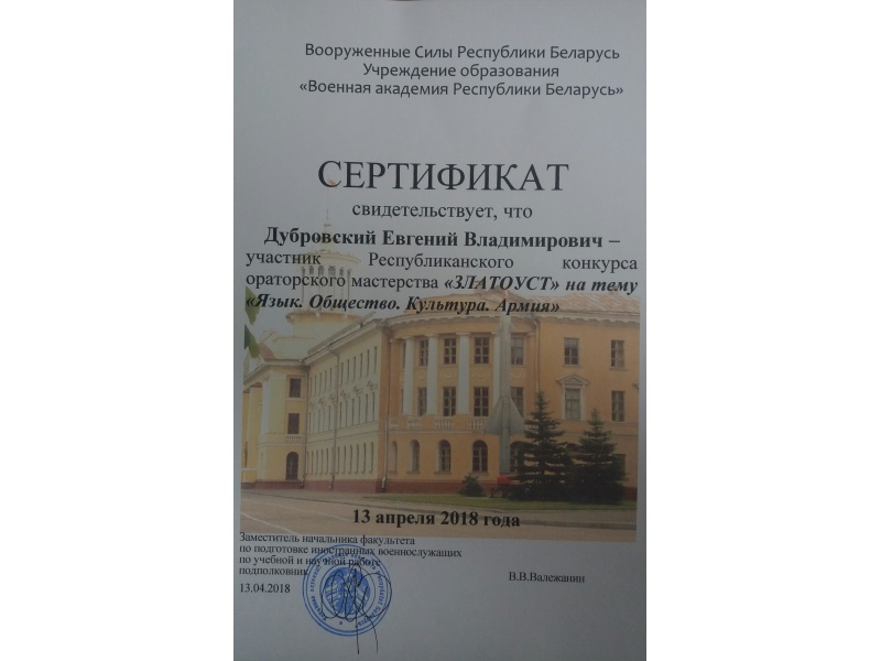 [node:title]13 апреля 2018 года в Военной академии Республики Беларусь состоялся ежегодный республиканский межвузовский конкурс ораторского мастерства "Златоуст". Тема конкурса была определена как «Язык. Общество. Культура. Армия». Два представителя БГАТУ продемонстрировали свое ораторское мастерство в категории среди белорусских студентов и один представитель - среди студентов из дальнего зарубежья (ЮАР).