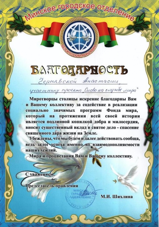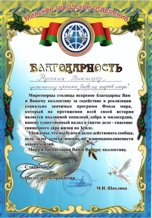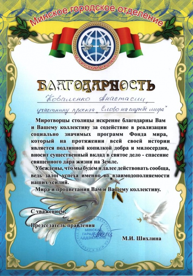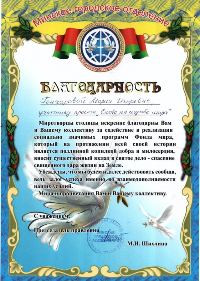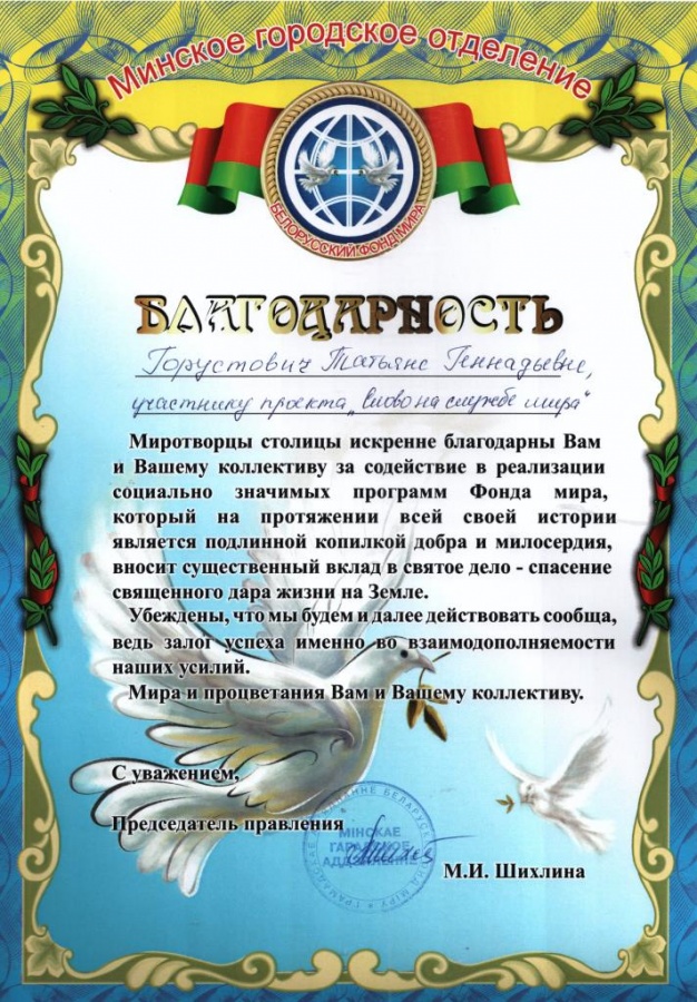 Целью деятельности Белорусского фонда мира является укрепление мира, дружбы, взаимопонимания и согласия между людьми и народами, пропаганда и воплощение в жизнь идей милосердия и гуманизма. Этой организацией проводится немало мероприятий направленных на гражданско-патриотическое воспитание молодежи.