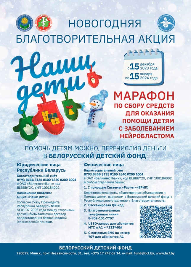 Новогодняя благотворительная акция «Наши дети» стартует 15 декабря. На протяжении месяца представители госорганов, предприятий, организаций, силовых структур и простые белорусы посетят детские дома, интернаты и больницы. Неофициальный девиз благотворительной кампании – «без внимания не останется ни один ребенок». Желающих помочь и прийти в гости к детям с нужными подарками много. Каждый день присоединяются все новые участники – государственные и частные предприятия, организации, общественные объединения и просто неравнодушные люди. Благотворительная кампания «Наши дети» по традиции пройдет с 15 декабря по 15 января. Без внимания не останутся и пожилые граждане Беларуси. Для них состоится акция – «От всей души».