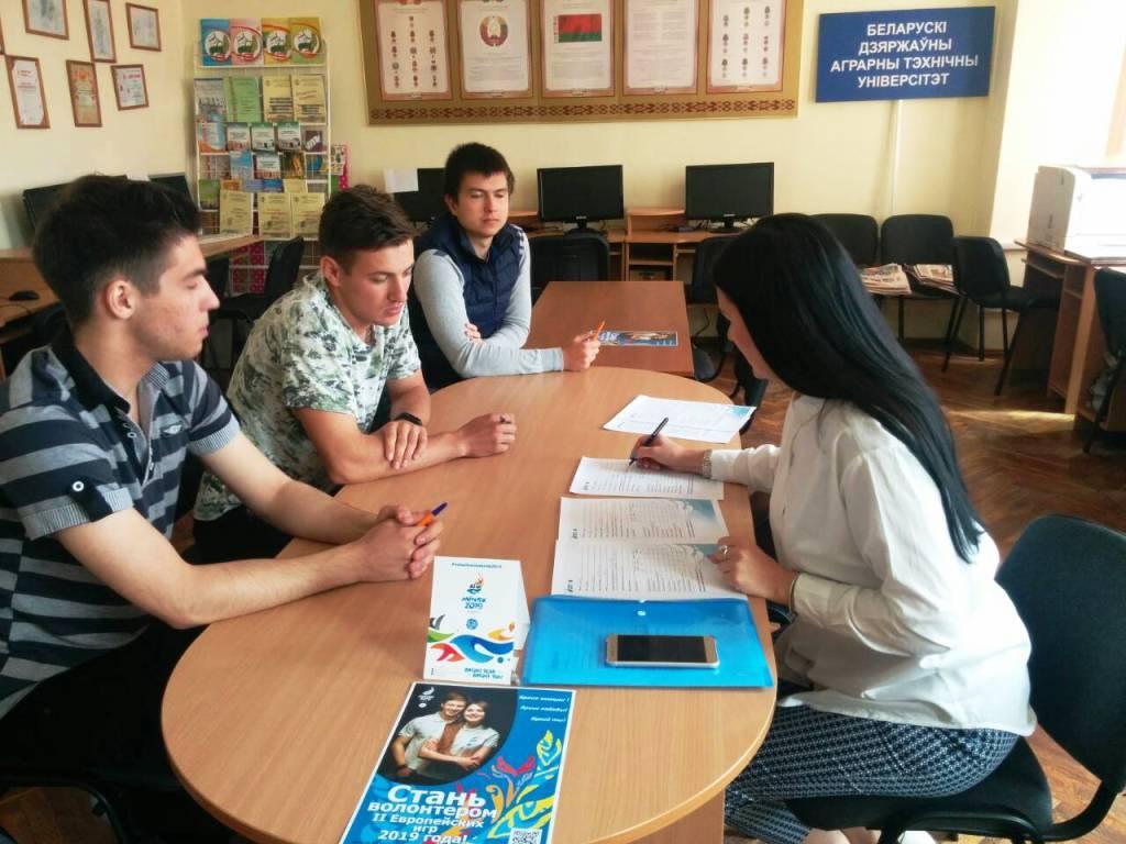 21.05.2018Отдел по идеологической и воспитательной работе21 мая 2018 года в университете прошло собеседование с кандидатами в волонтёры II Европейских игр 2019 года. Подробнее Фотогалерея: Теги: молодёжь БГАТУ, волонтёры, II европейские игры 2019