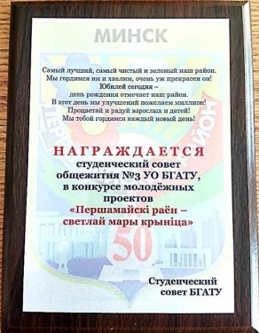 К 50-летию Первомайского района г. Минска в общежитиях Белорусского государственного аграрного технического университета прошел конкурс молодежных проектов в рамках акции "Першамайскі раён - светлай мары крыніца". Каждое общежитие подготовило проект к юбилейной дате: общежитие №3 - "Прошлое и настоящее Первомайского района", общежитие №7 - "Первомайский район глазами иностранных студентов".