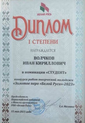 Студенты и работники БГАТУ стали участниками районного этапа республиканского конкурса работ творческой молодежи «ЗОЛОТОЕ ПЕРО «БЕЛОЙ РУСИ» – 2023!». В этом году желающим участникам было предложено представить на конкурс свои творческие размышления в жанре эссе на тему «Отчизне в дар останутся…» – семейные истории о родных, чей созидательный труд внес существенный вклад в укрепление мира и развития нашей страны. 15 мая 2023 года в администрации Первомайского района г. Минска в торжественной обстановке были подведены итоги конкурса. Студент 2 курса ФПУ Иван Волчков,... читать далее