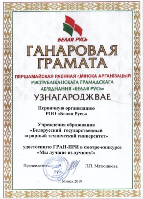 Студенты БГАТУ стали участниками районного этапа республиканского конкурса «ЗОЛОТОЕ ПЕРО БЕЛОЙ РУСИ - 2019!». 5 июня 2019 года в администрации Первомайского района г. Минска в торжественной обстановке были подведены итоги конкурса. Студентка 1 курса АМФ Марина Доморацкая удостоена Диплома 2 степени, студент Виталий Матюшонок награжден поощрительным призом за участие. Поздравляем!