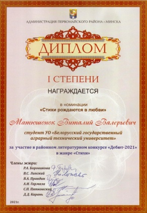 Администрация Первомайского района г. Минска 2 декабря 2021 года подвела итоги литературного конкурса «Дебют» . В 21-й раз проводится этот конкурс в Первомайском районе. Участвуют в нем непрофессиональные литераторы самого разного возраста. На конкурс прислали работы более 200 участников. Были предложены следующие творческие темы: «Мы адзiн народ — у нас адна краiна», «Новы дзень, якім я яго ўбачыў раніцай …» и «Стихи рождаются в... читать далее