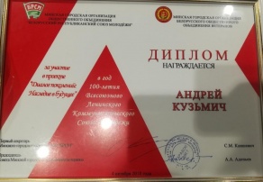 4 октября 2018 года активисты БРСМ БГАТУ приняли участие в мероприятии "Диалог поколений: Наследие в будущее", посвященном 100-летию Всесоюзного комсомола и приближающейся 75-й годовщине освобождения Минска от немецко-фашистских захватчиков. Подробнее