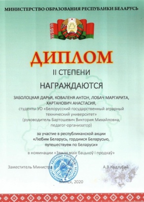 Подведены итоги Республиканской акции «Любим Беларусь, гордимся Беларусью, путешествуем по Беларуси», целью которой было приобщение студенческой молодежи к изучению исторического, культурного и природного наследия страны. Организатором мероприятий республиканской акции является Министерство образования Республики Беларусь, учреждение образования «Республиканский центр экологии и краеведения».