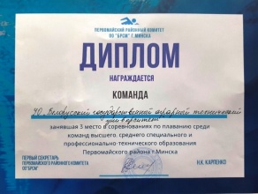 6 февраля 2021 года команда студентов БГАТУ приняла участие в соревнованиях по плаванию. Участвовали команды высших и средних специальных учреждений образования Первомайского района. Всего состязались между собой 30 участников. Было разыграно 4 комплекта медалей. Соревнования проводились на дистанции 50 метров в командном и индивидуальном зачетах. После завершения заплывов состоялась торжественная церемония награждения, в которой приняли участие администрация ФОЦа и Первомайского РК ОО «БРСМ».... читать далее