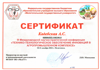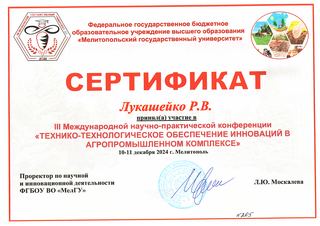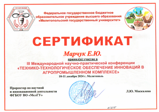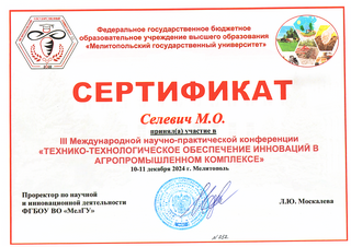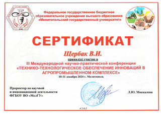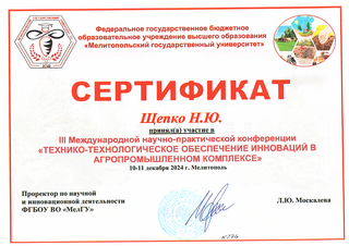 Студенты из 19а группы приняли участие в III Международной научно-практической конференции «ТЕХНИКО-ТЕХНОЛОГИЧЕСКОЕ ОБЕСПЕЧЕНИЕ ИННОВАЦИЙ В АГРОПРОМЫШЛЕННОМ КОМПЛЕКСЕ», которая проходила 10-11 декабря 2024 г. в Мелитополе.