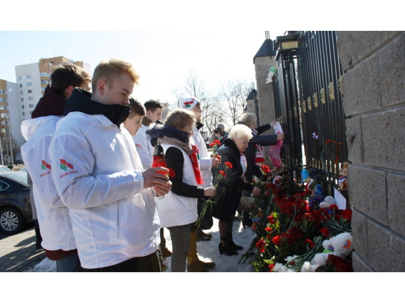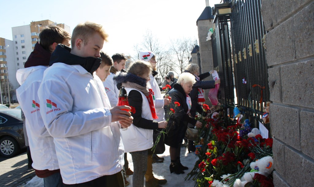 [node:title]Минский городской исполнительный комитет установил у здания посольства России в Беларуси баннер в память о жертвах трагедии в Кемерово. Студенты и работники университета оставили цветы и игрушки в знак скорби и поддержки родственников погибших и пострадавших при пожаре в кемеровском торговом центре. Мы не могли сдержать слез. Ваша боль - наша боль. Акция