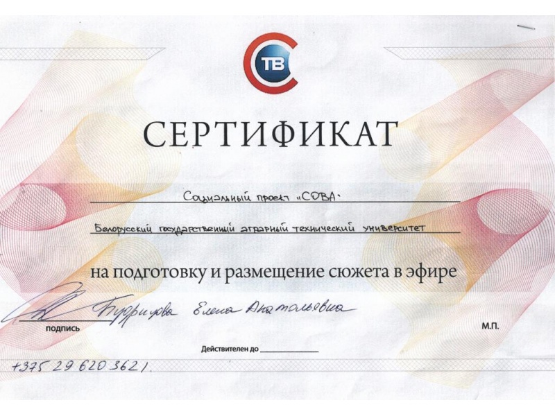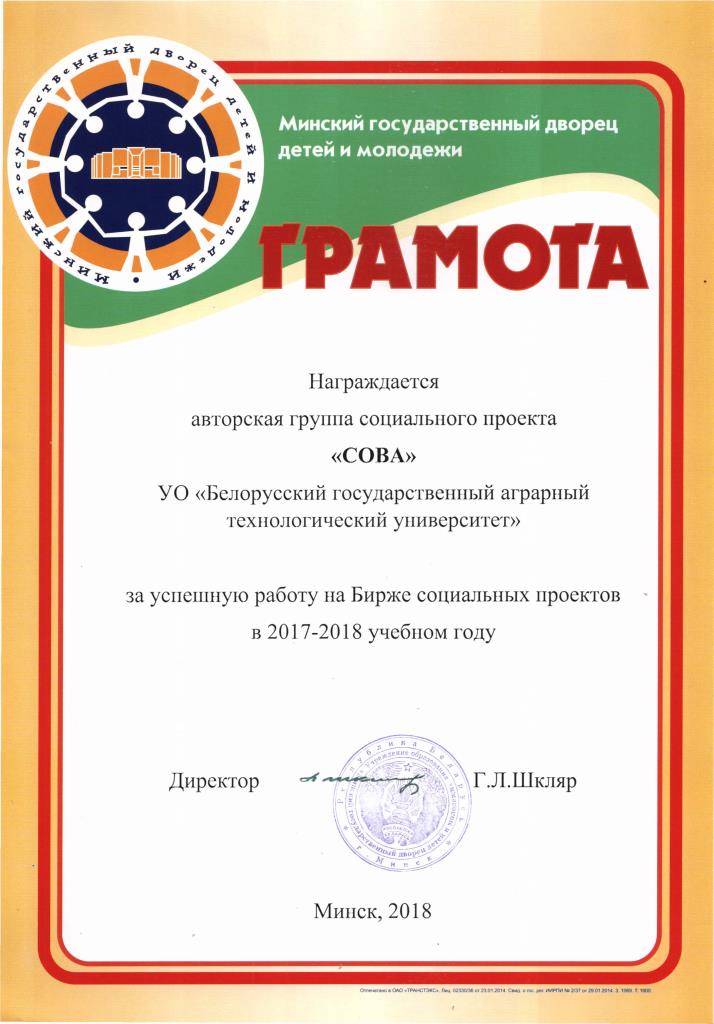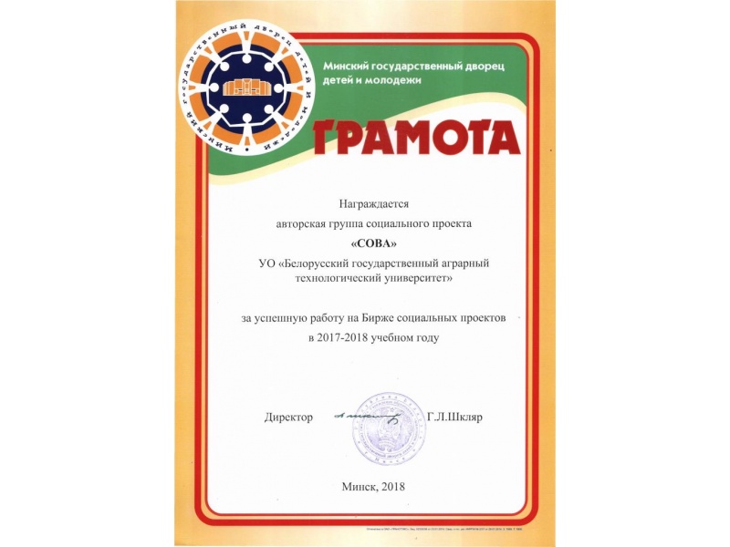 [node:title]20 апреля 2018 года  в Минском государственном дворце детей и молодежи состоялась торжественная церемония вручения наград  Биржи социальных проектов — Премия «Спасибо!». Волонтерский проект "СОВА" получил грамоту Минского государственного дворца детей и молодежи и Специальный приз – сертификат на подготовку и размещение сюжета о волонтерах на канале СТВ. Молодцы ребята!