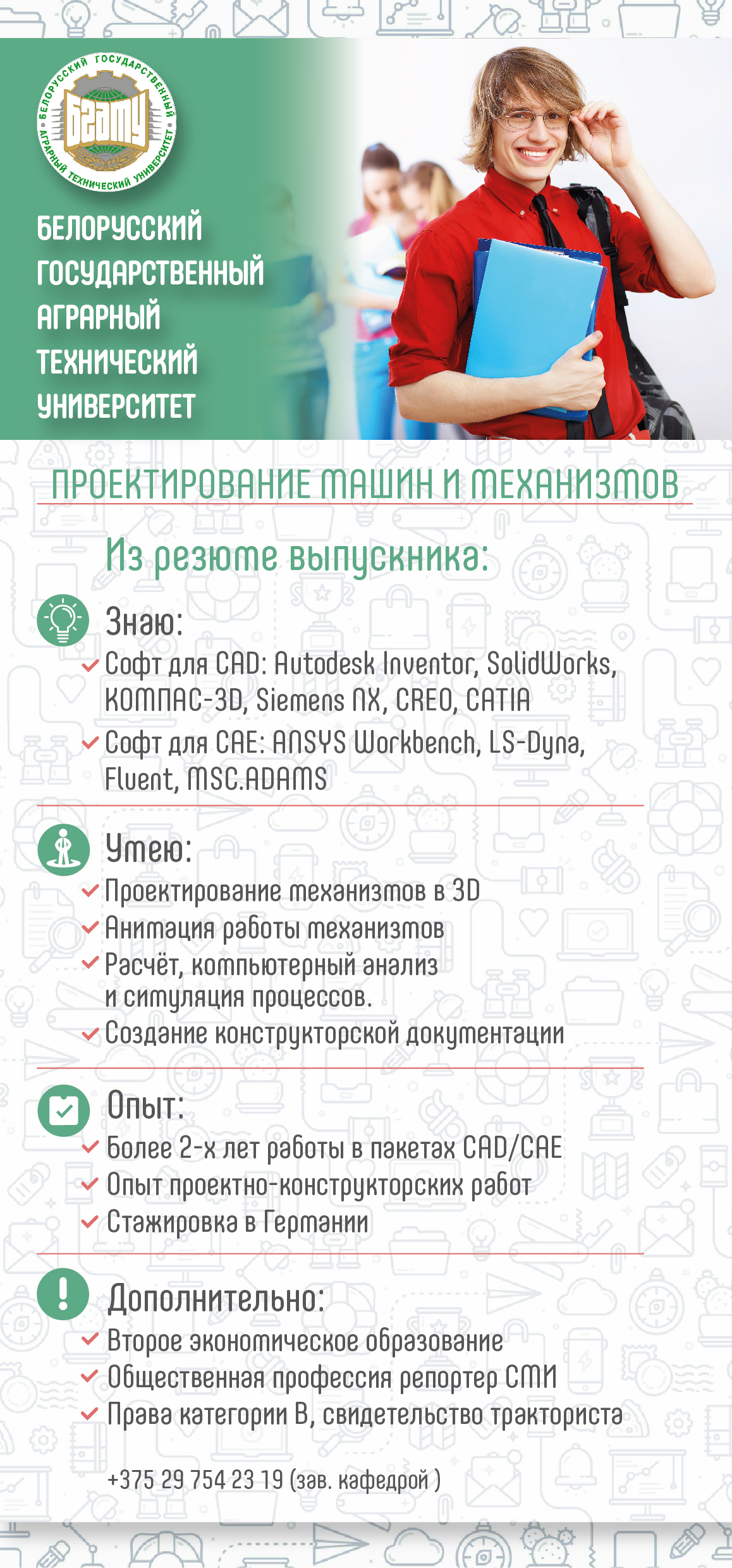 А теперь о профессии. Что мы имеем на выходе? Конечно специальности разные и отношение к учебе у студентов тоже. Но вот выдержка из резюме выпускника специальности 1-36 12 01 «Проектирование и производство сельскохозяйственной техники»: