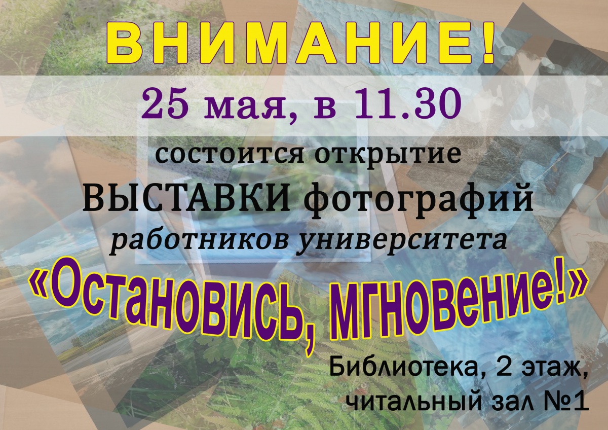 23.05.2022Библиотека25 мая 2022 года состоится открытие выставки фотографий работников университета «Остановись, мгновение!». Начало в 11.30, библиотека (читальный зал №1, УЛК1). Приглашаем всех желающих! Теги: выставка, библиотека